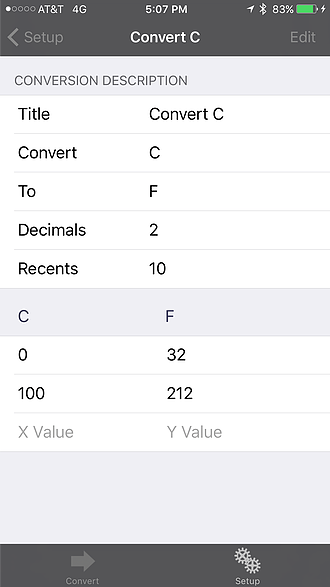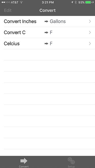 Setup lists the current conversions that have been configured. Tap the + sign to configure a new conversions.