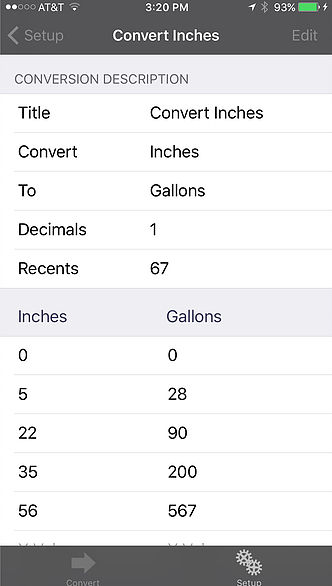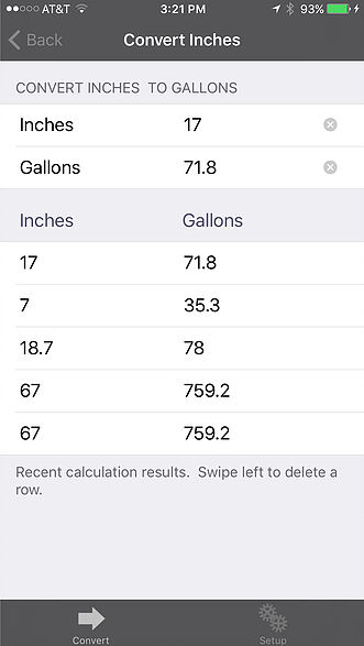 Conversion of pressure ( 17 inches ) to gallons ( 71.8 gallons). Previous conversions are shown in the list below making it easy to keep track of changing values. Items can be deleted from this list by swiping to the left on any item.